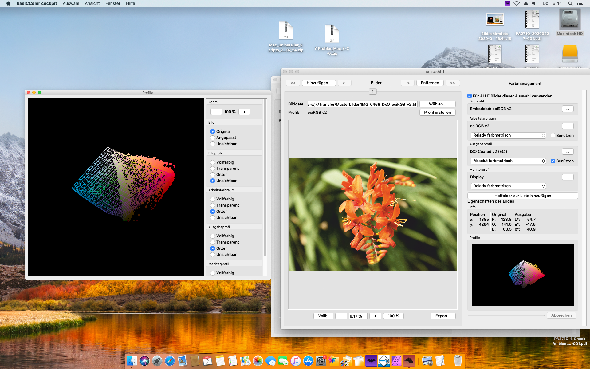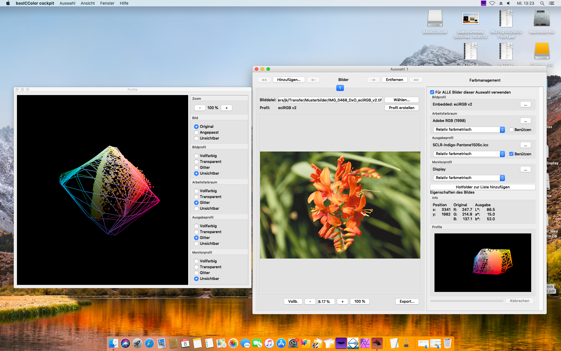 Jedes Bild kann über ICC-Profile in jeden beliebigen Farbraum umgerechnet werden. Dabei werden Quell- und Zielprofil sowie der Rendering Intent berücksichtigt, wie für dieses Bild eingestellt und als Softproof angezeigt. Damit bleiben Überraschungen nach der Konvertierung aus – What You See Is What You Get!