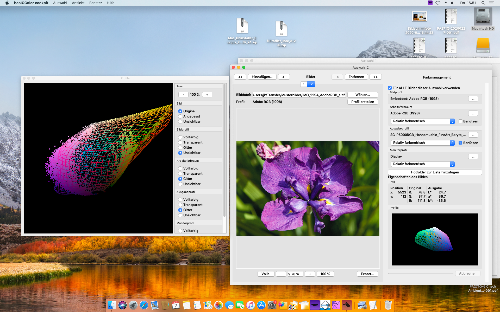 Durch Zuweisen von Arbeitsfarbraumprofil und/oder Ausgabeprofil sowie Rendering Intent kann sofort die Veränderung beurteilt werden, die durch eine Umrechnung in diese Farbräume entstehen würde.