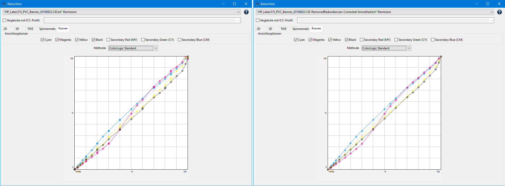 Immer dann, wenn der Druck nicht ganz konstant ist - wie z.B. bei vielen Produktions- druckern (z.B. Latex-Drucker) oder tonerbasierten Systemen ist das Korrigieren und Glätten von Messdaten zu empfehlen.