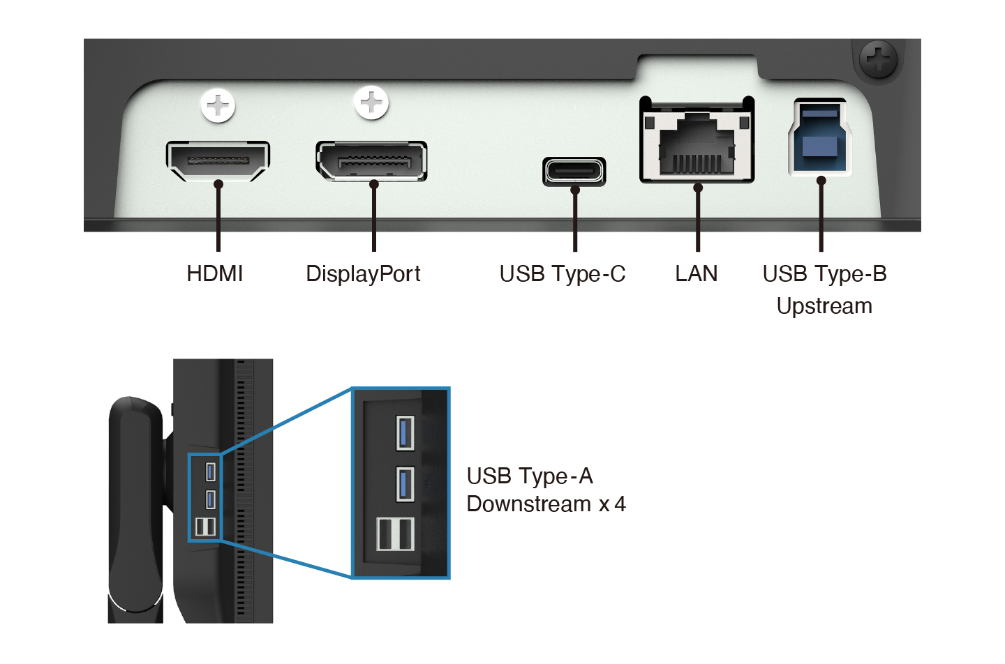 3 Eingänge für das Monitorsignal – 1 x DisplayPort, 1 x HDMI, 1 x USB-C, USB Anschlüsse USB 3.1 Gen1: 1 x USB-Upstream-Anschluß USB-C (DisplayPort Alt Mode) 1 x USB-Upstream-Anschluß Typ B 4 x USB-Downstream - Anschluß Typ A (2 x USB 3.1 Gen 1, 2 x USB 2.0) 1 x LAN GigaBit (Kabel)