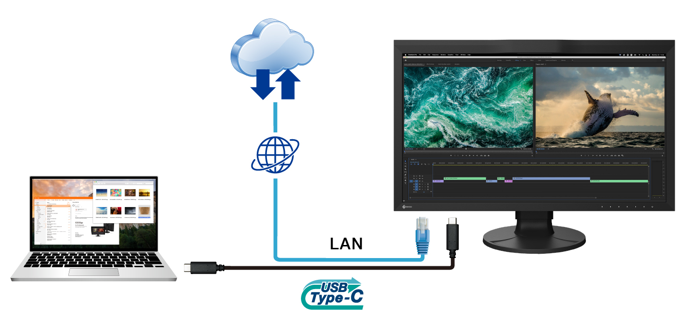 Modernste Konnektivität mit USB-C - Bildsignal, USB-Datenübertragung sowie Stromversorgung mit bis zu 92 W, all das und noch mehr lässt sich mit einem einzigen USB-C-Kabel realisieren. So wird der ColorEdge CG2700S zum zentralen Dock des grafischen Workflows. Peripheriegeräte wie z. B. Maus, Tastatur oder Drucker können direkt an die USB-A-Ports angeschlossen werden. Mobilgeräte wie Laptops oder Tablets können über das USB-C-Kabel dabei sogar mit bis zu 92 W aufgeladen werden. So wird aus Laptop und CG2700S mit einem kurzen Handgriff ein vollwertiger Desktop-Arbeitsplatz.