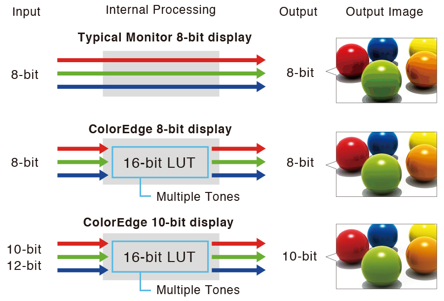 Die LUT (Look-Up-Table) des CG2700S rechnet intern mit einer extrem hohen Farbtiefe von 16 Bit und das Panel gibt die Signale dann mit bis zu 10 Bit aus. Dadurch stehen zur Berechnung der präzisen Monitordarstellung Milliarden von Farbtönen zur Verfügung. Vom Monitor verursachte Darstellungsfehler wie Banding oder Clipping, die sich in Tonwertabrissen in Verläufen oder Farbstichen in den Graustufen auswirken, werden so wirksam verhindert. Auch feine Nuancen und Strukturen in dunklen oder stark gesättigten Bildbereichen werden dadurch noch differenziert und detailgetreu dargestellt.