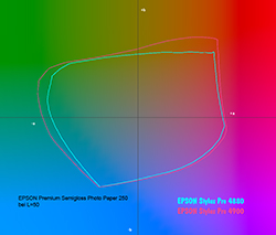 Farbraumvergleich EPSON Stylus Pro x880 und EPSON Stylus Pro x900 für EPSON Premium Semigloss Photo Paper 250 bei L=50