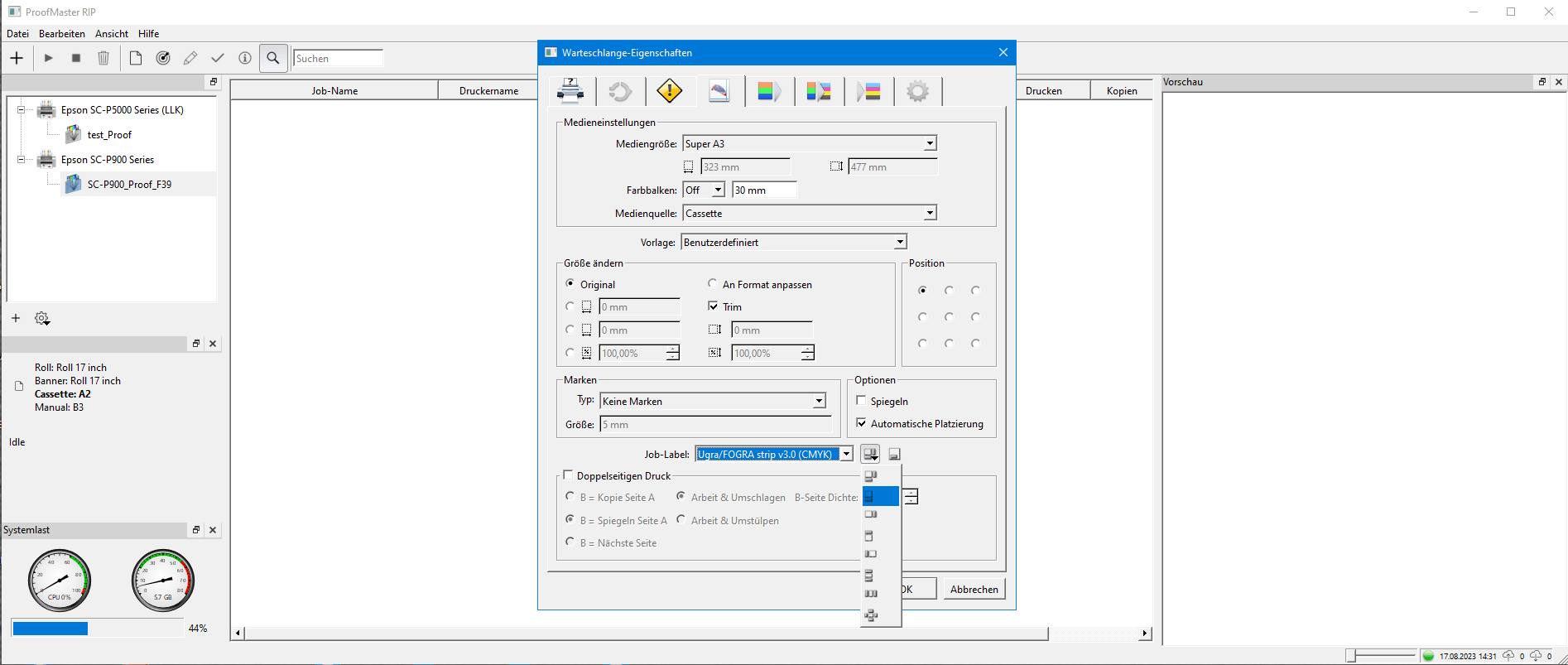 * Unterstützung des EPSON Surecolor SC-P900 und sogar des SC-P700. Der SC-P700 ist ein A3plus-Drucker, nach langer zeit wird erstmals wieder ein A3plus Drucker von einem Proof-RIP unterstützt. * Bei der Einstellung, ob der FOGRA Medienkeil unter den Proof gesetzt werden soll, kann ausgewählt werden ob der “klassische” CMYK-Medienkeil oder der um die ersten 12 Sonderfarben in der Datei ergänzte gedruckt werden soll.